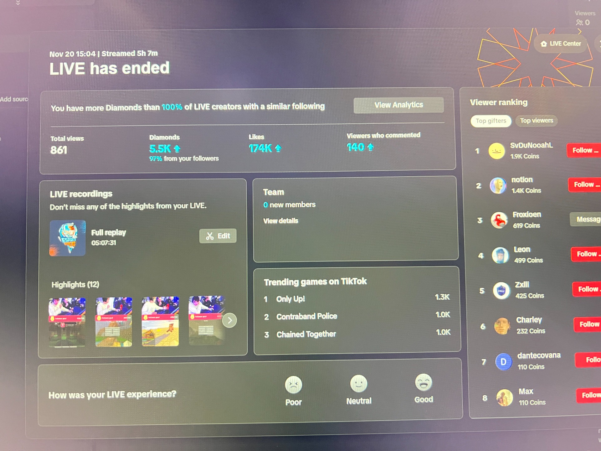 De livestream was een doorslaand succes. Binnen korte tijd bereikten we bijna 700 volgers op TikTok en verzamelden we maar liefst 175.000 likes. Met meer dan 900 views en 5,5K diamonds was het duidelijk dat we iets bijzonders hadden neergezet. Maar wat écht indruk maakte, was het feit dat zo'n 97% van onze volgers betrokken was. Het gaf ons een enorme boost om door te gaan en de server nóg beter te maken.